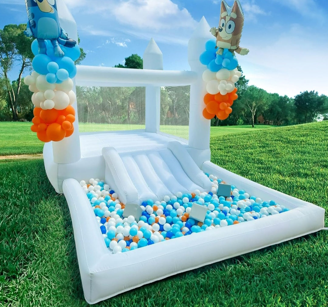 Transform any celebration into an unforgettable experience with this 13ft white bounce house castle. Perfect for weddings, toddler parties, and themed events, its classic white design complements any décor. The integrated slide adds excitement while the spacious interior accommodates multiple children safely. Customize your setup with balloon arches, ball pits, or additional decorations to match your vision. An ideal rental or purchase for event planners and parents seeking versatile, engaging entertainment that grows with your creative ideas.
